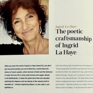 Wanneer je de wereld van Ingrid La Haye betreedt, ervaar je meer dan sieraden alleen. Je stapt binnen in een verfijnde wereld waarin de kracht en stilte van de natuur samenkomen. De organische structuren van boomschors en de fonkeling van water worden vertaald naar tijdloze ontwerpen in zilver, goud, brons en koper. Vanuit Nederland creëert Ingrid La Haye al meer dan twintig jaar unieke, draagbare kunstwerken waarin natuurlijke elegantie en ambacht perfect in balans zijn. “Door de natuur geïnspireerde sieraden” — een belofte die zij in elk ontwerp waarmaakt.